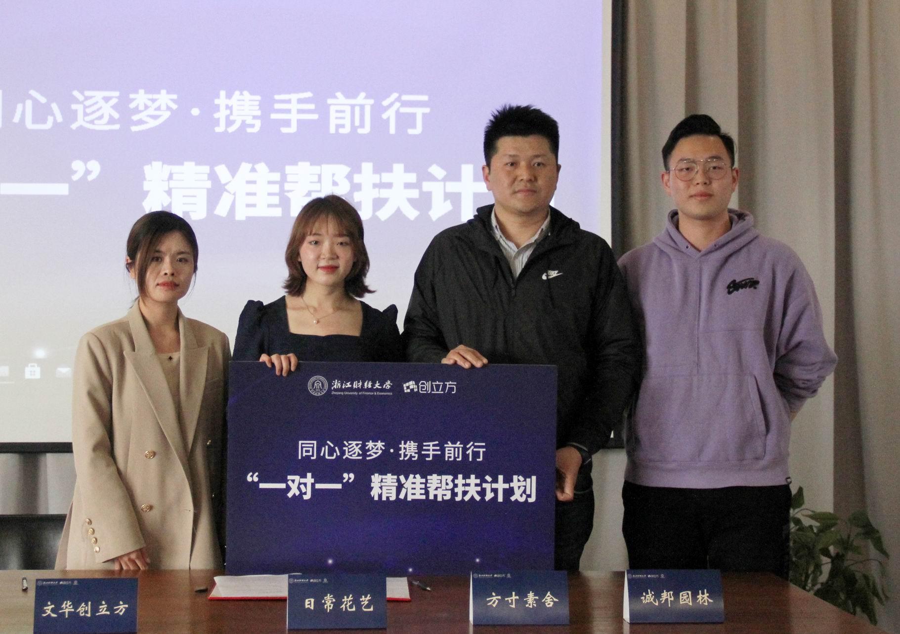 为实现学校与创立方资源共享、优势互补、互利互赢的合作机制,让更多大学生的创新创业之梦在这里扬帆起航,企业代表文华创立方、诚邦园林与学生创业项目代表方寸素舍、日常花艺共同签署了一对一帮扶计划合作书。