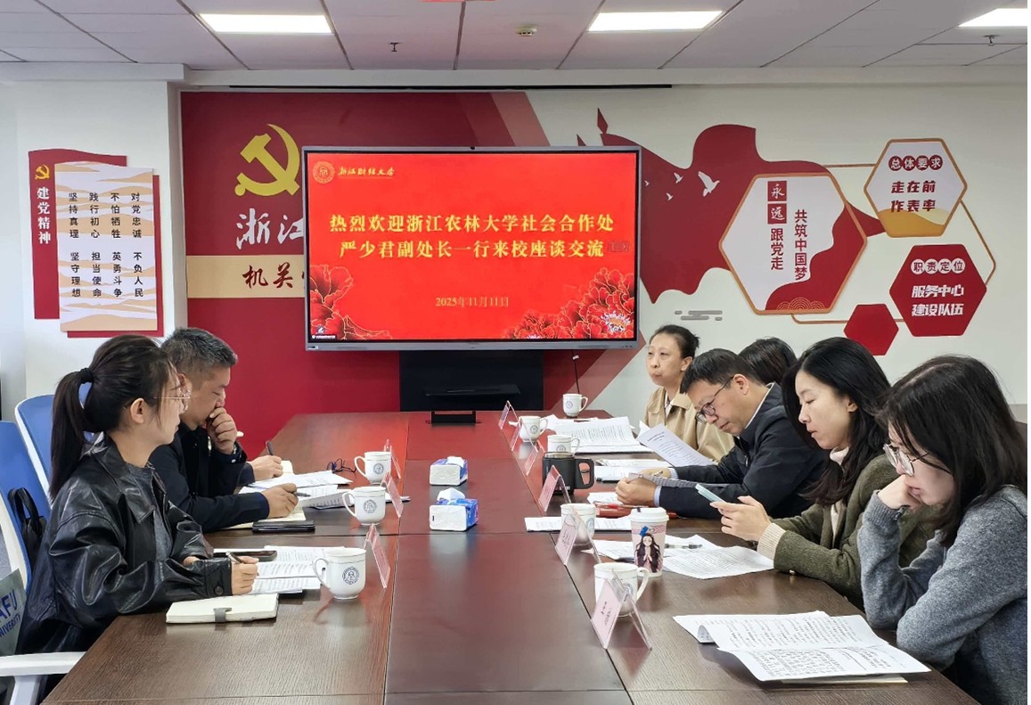 11月11日上午,浙江省高校助力乡村振兴联盟秘书处、浙江农林大学社会合作处副处长严少君一行到校调研,社会合作处杨剑勇处长热情接待。