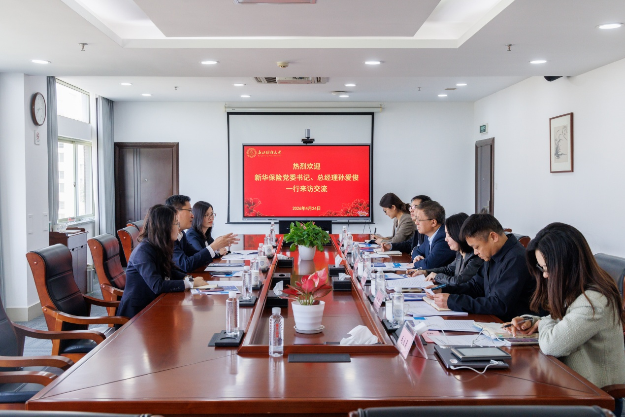 4月24日,新华保险浙江分公司党委书记、总经理孙爱俊一行来校调研交流,校党委书记魏江热情接待了来访客人。